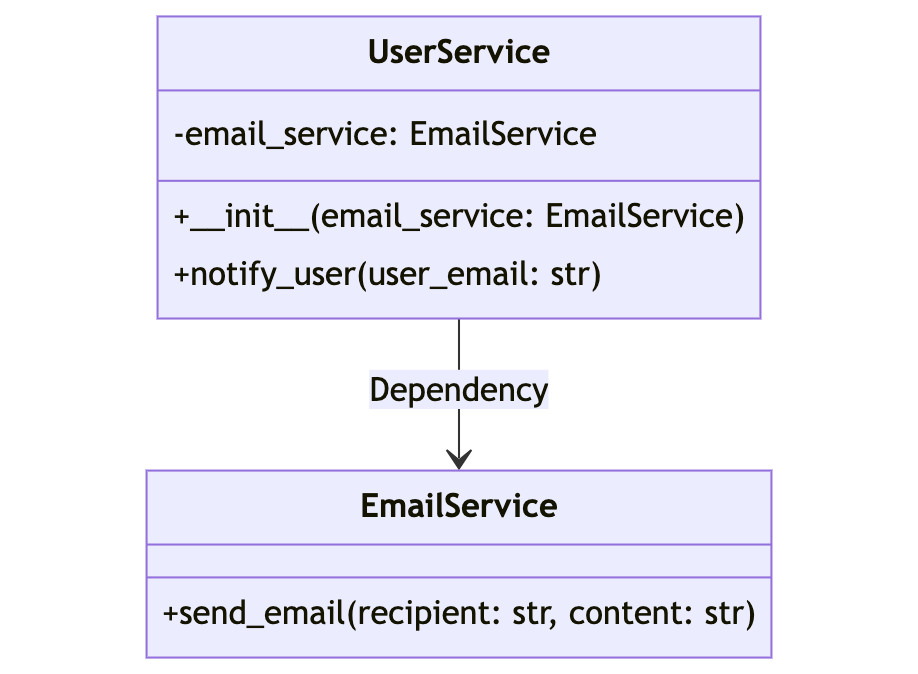 - 의존성을 직접 생성하는 경우 : UserService -> EmailService 인데, UserService는 추상화 단계를 벗어난, 어느 정도 범용성이 있는 상위 개념의 객체이다. EmailService는 UserService의 구체적인 구현이자 하위 개념이다. 의존성이 생기는 경우는 상위 개념이 하위 개념 객체를 직접 다루려고 할 때(생성) 발생한다.